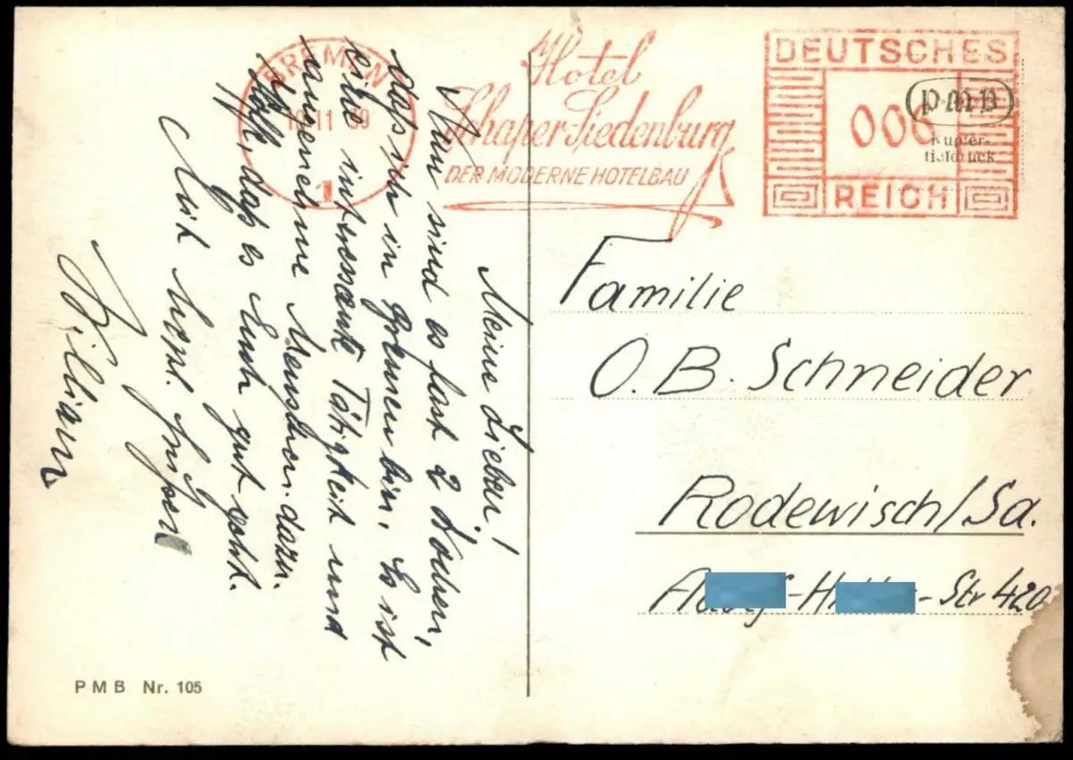 Gelaufen: 10.11.1939 mit Freistempel Hotel Schaper Siedenburg der moderne Hotelbau nach Rodewisch an Methodisten- Prediger Otto B. SchneiderErhaltung (s. Scan): mittel, oben mittig minimaler Einriss / 916445