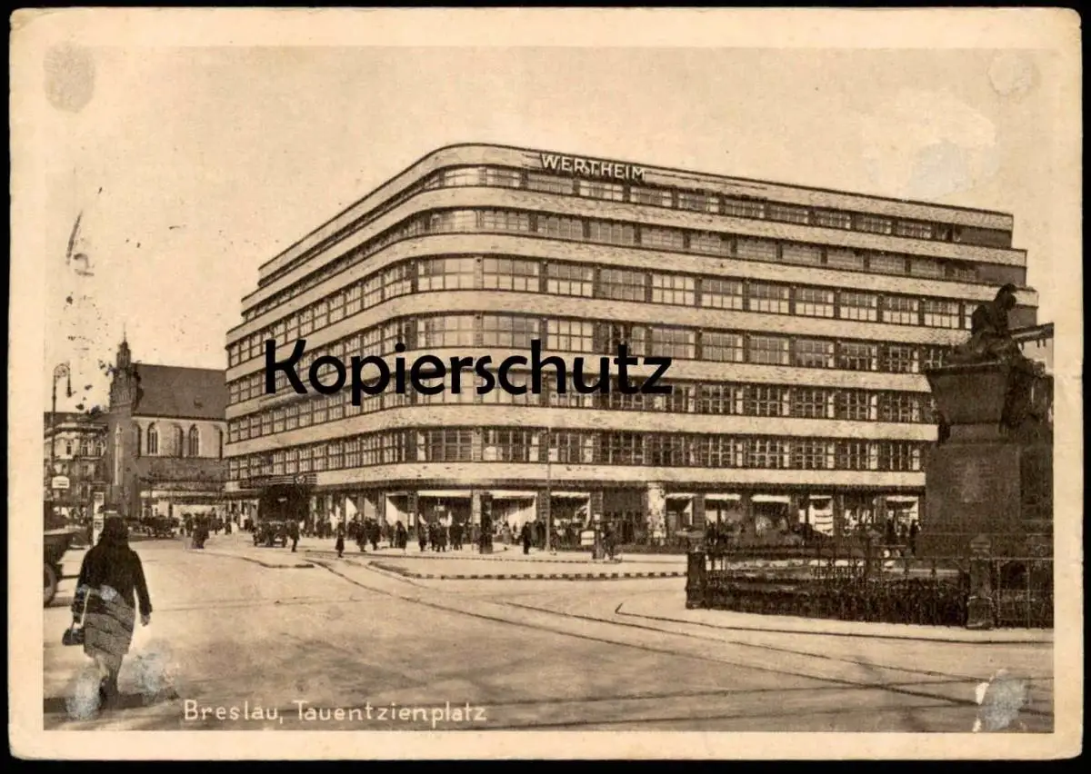 ALTE POSTKARTE BRESLAU TAUENTZIENPLATZ KAUFHAUS WERTHEIMVerlag: unbekanntGelaufen: 30.07.1938 mit Sonderstempel Deutsches Turn- und Sportfest Breslau 1938 nach Petersdorf Tschechische RepublikErhaltung (s. Scan): gut - mittel, vorderseitig in jeder Ecke leichte Albumklebespuren, rechter Rand bestoßen / 916622