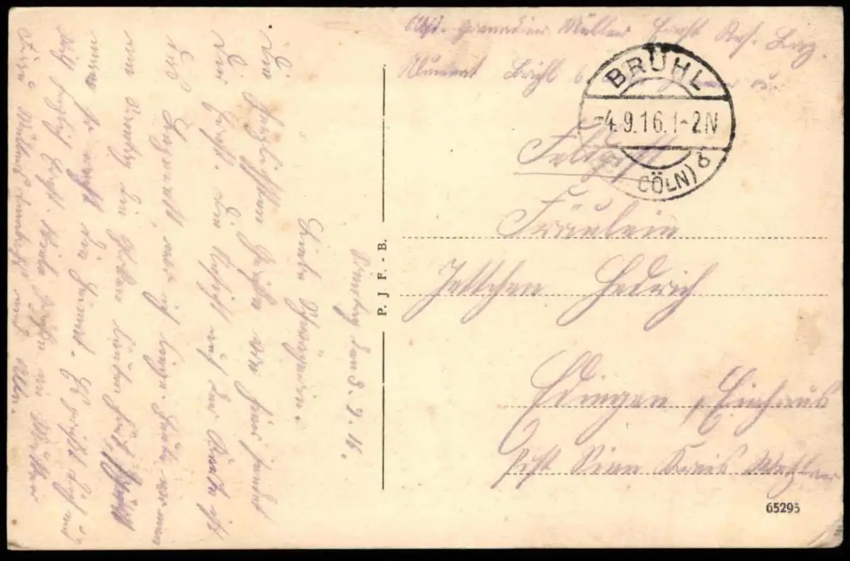 Verlag: P. J. F., B. Gelaufen: 04.09.1916 als Feldpost mit Stempel Brühl nach Edingen Post SinnErhaltung (s. Scan): gut, linke untere Ecke minimal bestoßen / 917239