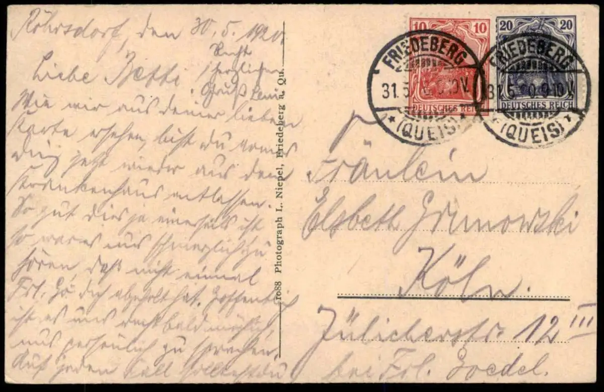 Gelaufen: 31.05.1920 mit Stempel Friedeberg Queis nach Köln