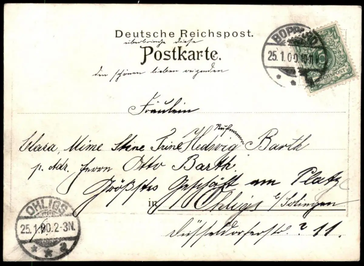 Gelaufen: 25.01.1900 mit Stempel Boppard nach Ohligs bei Solingen, Otto Barth, größtes Geschäft am Platze, Ankunftsstempel 25.01.1900