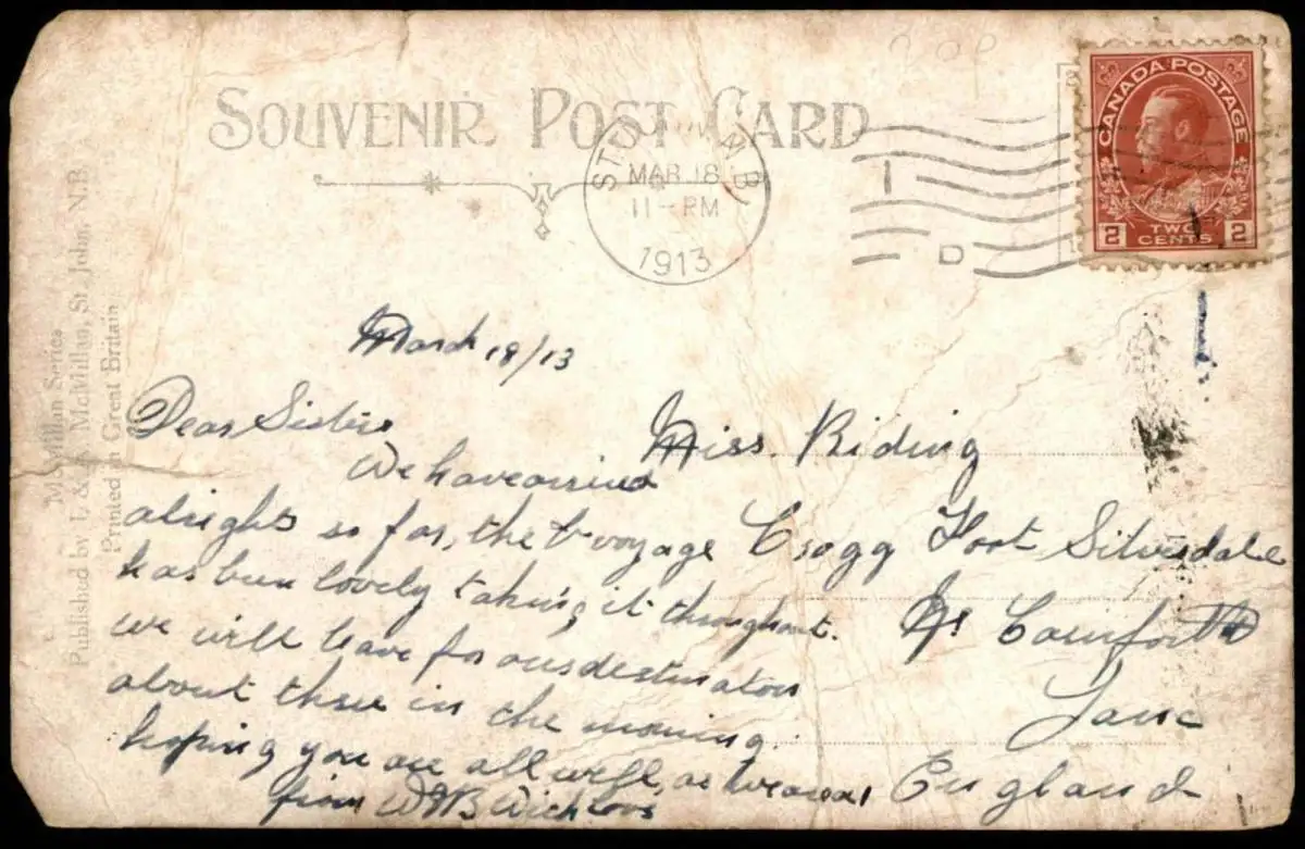 Gelaufen: 18.03.1913 mit Stempel St. John nach England