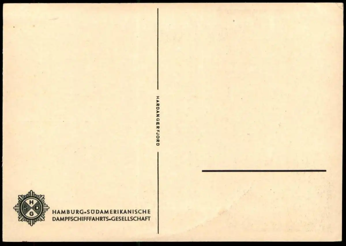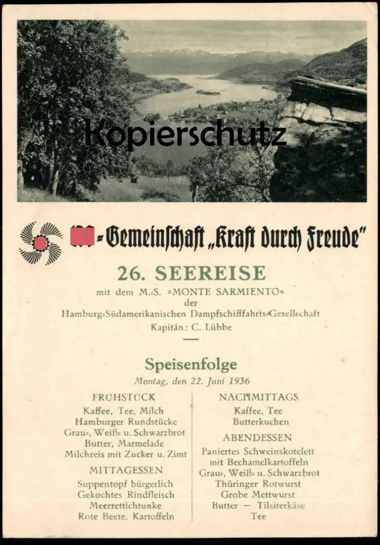 ALTE POSTKARTE 26. SEEREISE DAMPFER M.S. MONTE SARMIENTO KRAFT DURCH FREUDE HAMBURG SÜDAMERIKANISCHE DAMPFSCHIFFFAHRTS-GESELLSCHAFT KAPITÄN C. LÜBBE SPEISENFOLGE 22. JUNI 1936 NORWEGEN HARDANGERFJORD NORGEVerlag: HSDG