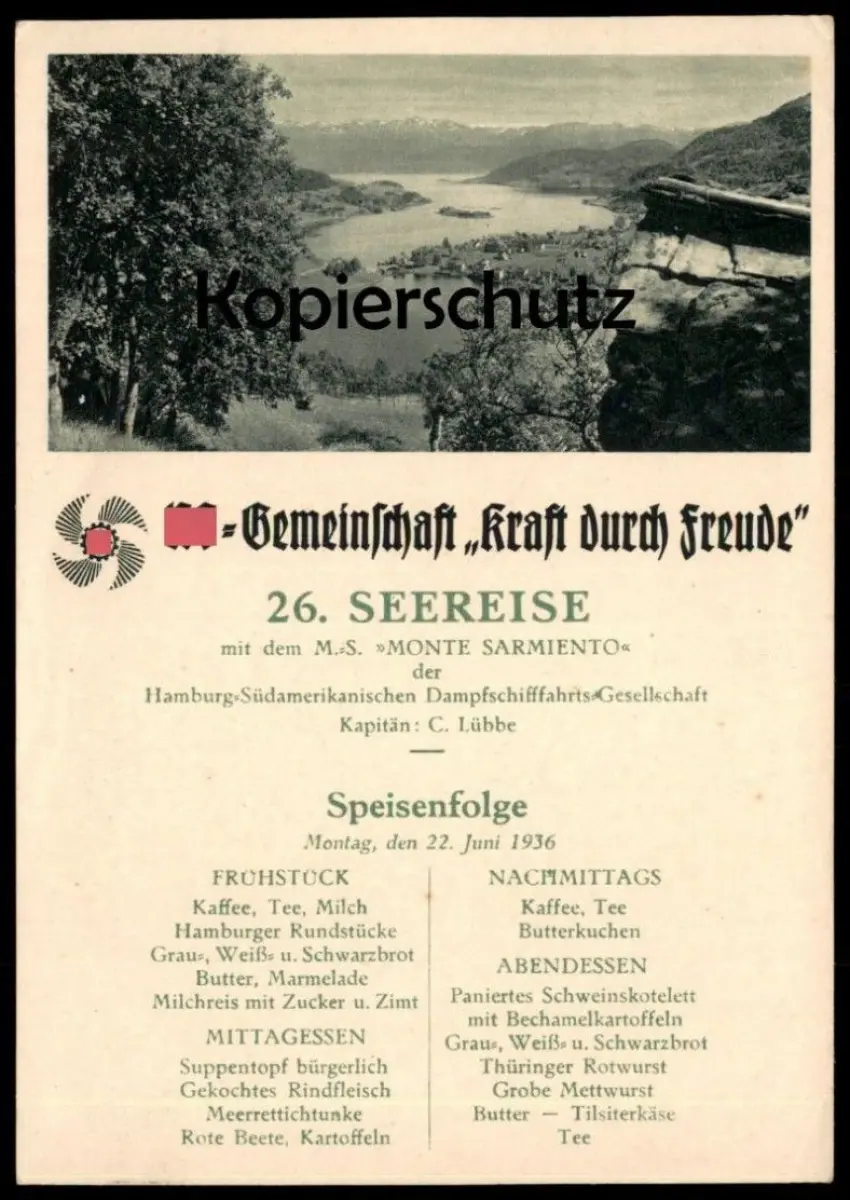 ALTE POSTKARTE 26. SEEREISE DAMPFER M.S. MONTE SARMIENTO KRAFT DURCH FREUDE HAMBURG SÜDAMERIKANISCHE DAMPFSCHIFFFAHRTS-GESELLSCHAFT KAPITÄN C. LÜBBE SPEISENFOLGE 22. JUNI 1936 NORWEGEN HARDANGERFJORD NORGE