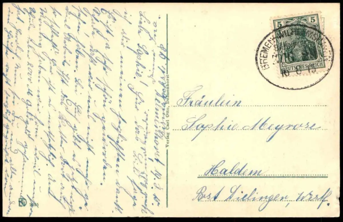 Gelaufen: 19.08.1915 mit Bahnpost-Stempel Zug 20 Bremen - Wilhelmshaven