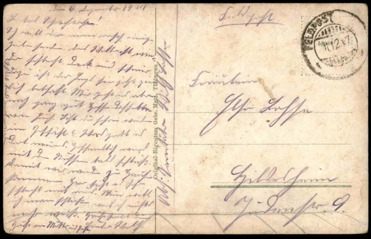 Gelaufen: 04.12.1914 mit Stempel Feldpost nach Hildesheim