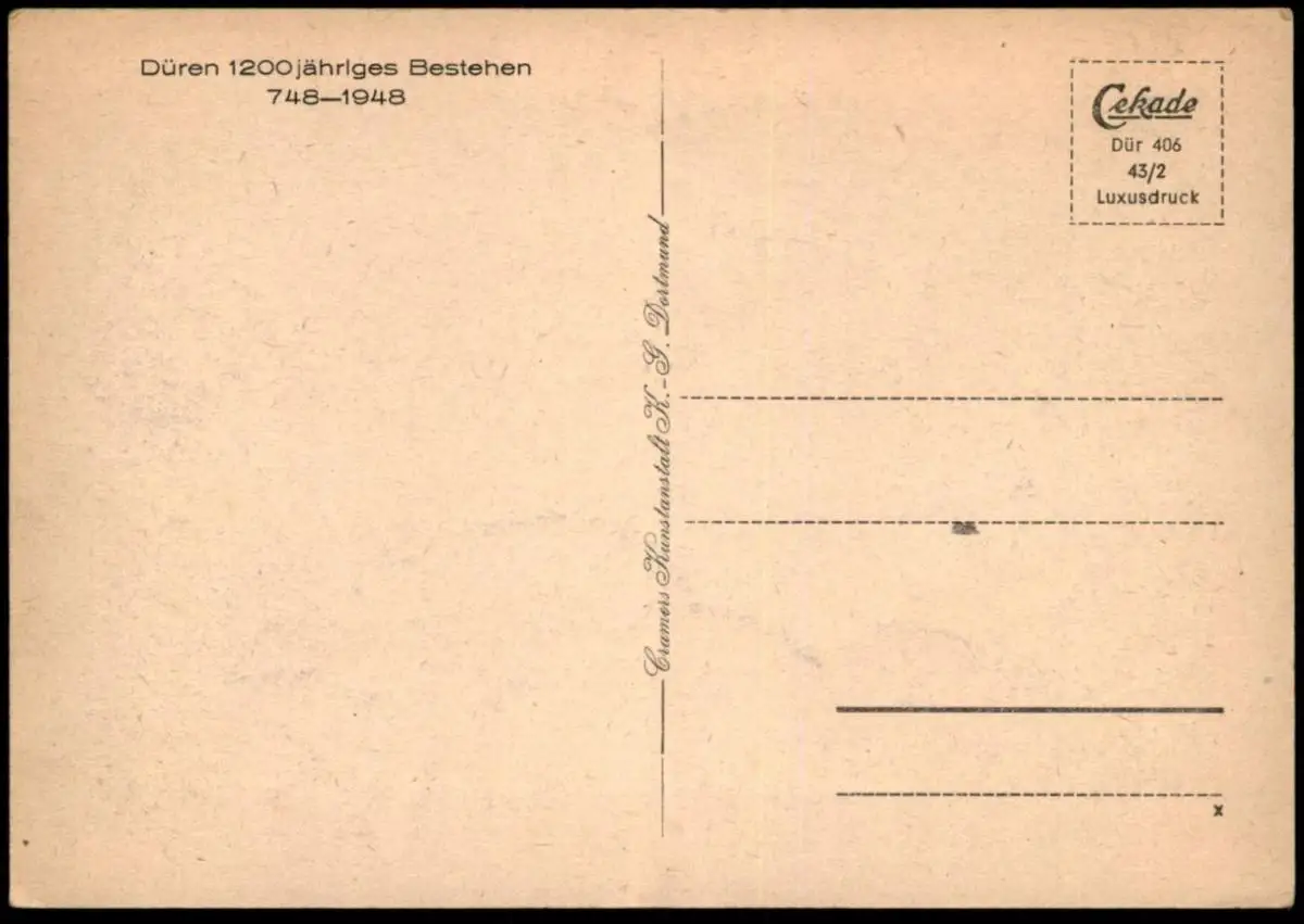 ALTE POSTKARTE DÜREN 1200 JÄHRIGES BESTEHEN 748-1948 MARKT STRASSENBAHN GESCHÄFT MÖBELHAUS LINKSSEITIGE BEFLAGGUNG DURCH VERLAG GESCHWÄRZTVerlag: Cramers, DortmundGelaufen: neinErhaltung (s. Scan): gut / 918579