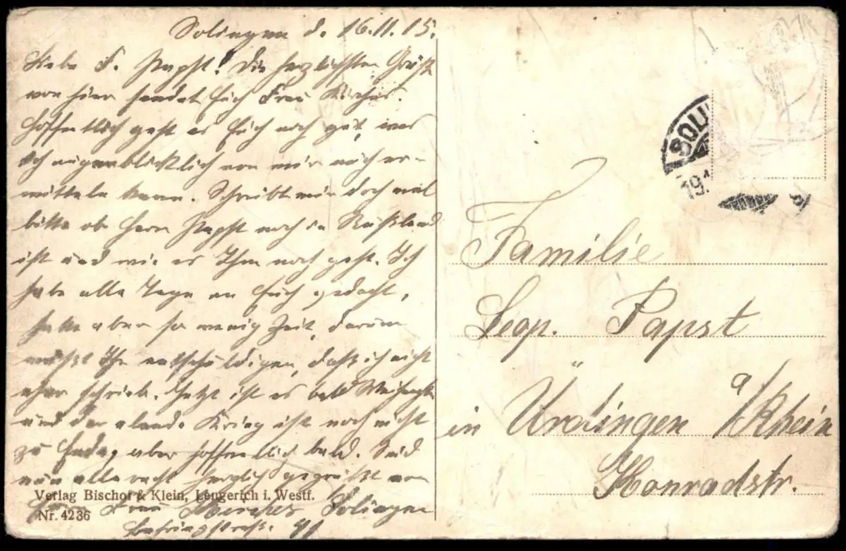 ALTE POSTKARTE 1. WELTKRIEG EISERNES KREUZ SPRUCH "UND OB SICH RINGS GEWITTER TÜRMEN IN WEST UND OST UM UNSERN PFAD, UNS SCHWANT, DASS AUCH IN DIESEN STÜRMEN EIN GOTTGESANDTER FRÜHLING NAHT!"Verlag: Bischof & Klein, LengerichGelaufen: 16.11.1915 mit Stempel Solingen nach Uerdingen, Briefmarke mit minimalen Spuren entferntErhaltung (s. Scan): mittel, Ecken bestoßen, vorderseitig Spur von Papier unter "Emanuel" / 915479