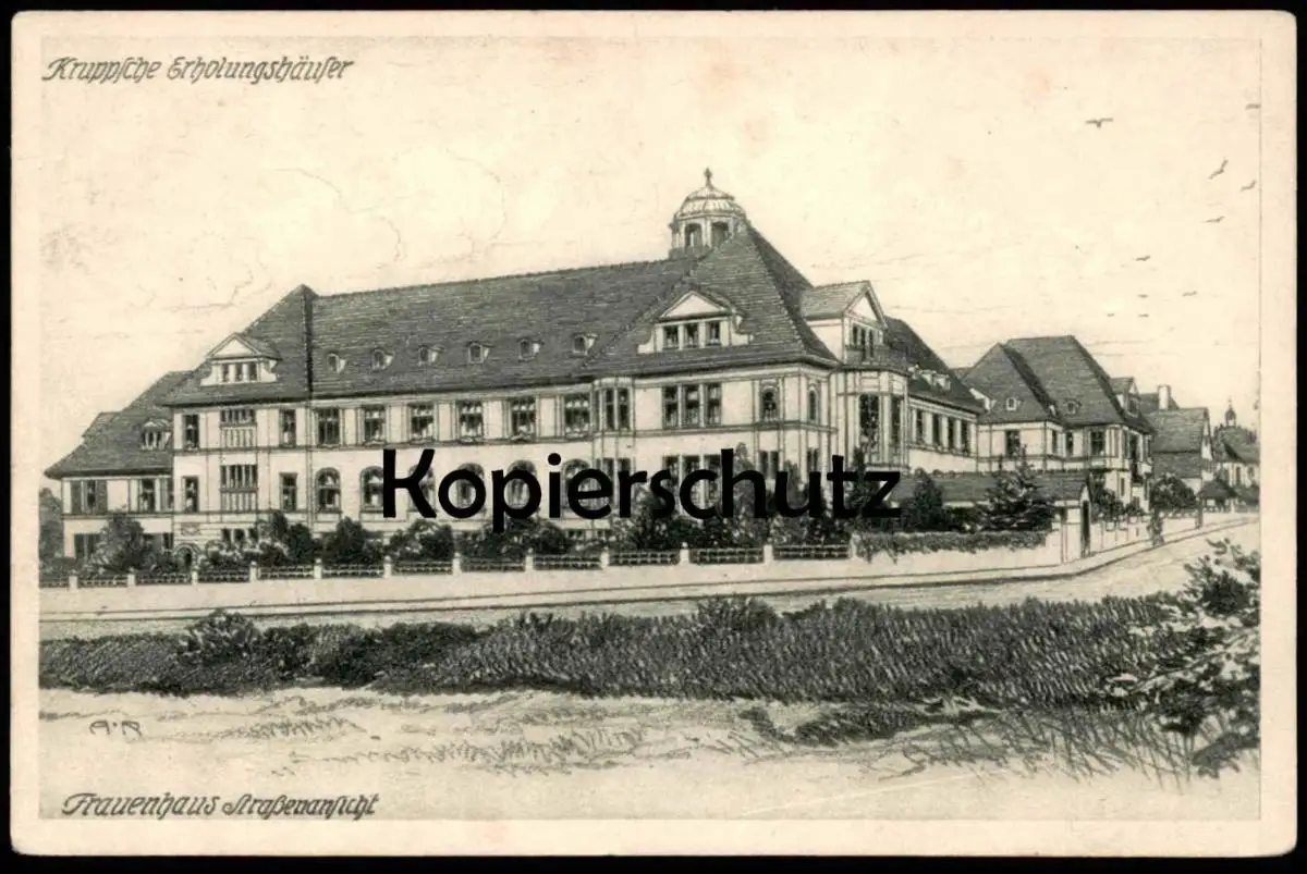 ALTE POSTKARTE ESSEN KRUPPSCHE ERHOLUNGSHÄUSER FRAUENHAUS STRASSENANSICHT KRUPP FELDPOST 1914 Ansichtskarte postcard cpa