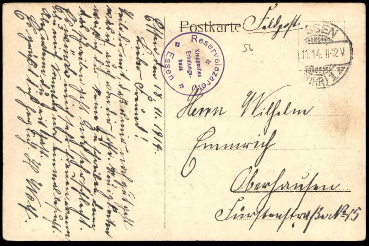 Gelaufen: 18.11.1914 mit Stempel Essen als Feldpost nach Oberhausen, zusätzlicher Stempel Reservelazarett Kruppsches Erholungshaus Essen
