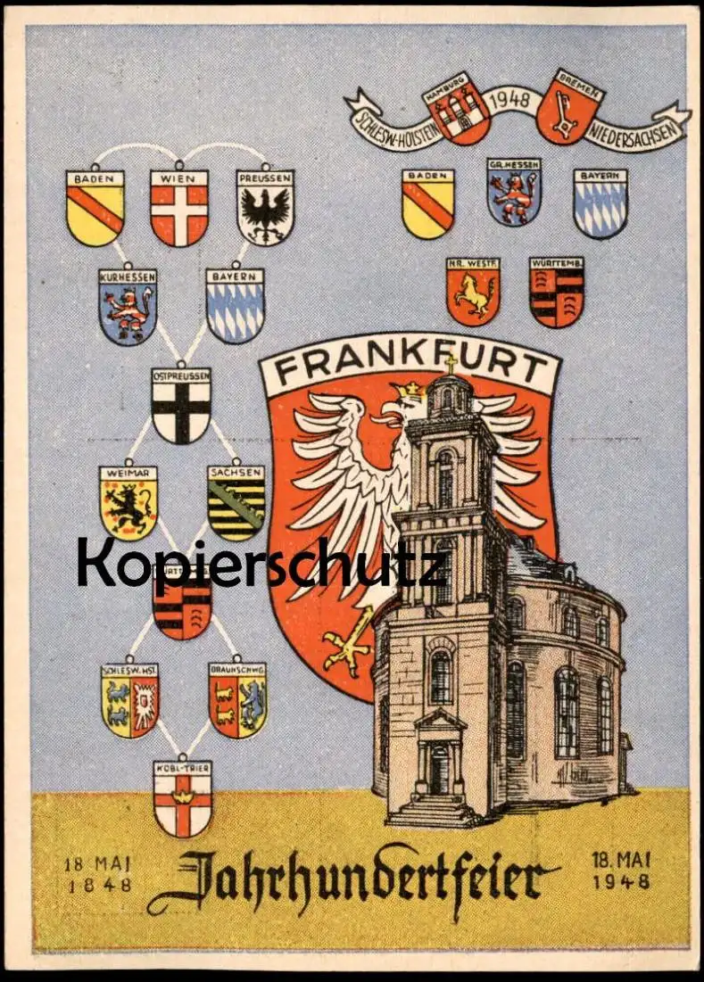 ALTE POSTKARTE FRANKFURT AM MAIN JAHRHUNDERTFEIER 18.05.1948 WAPPEN BADEN WIEN BAYERN OSTPREUSSEN SACHSEN KURHESSEN WEIMAR HAMBURG BREMEN HESSEN WÜRTTEMBERG NORDRHEINWESTFALEN PREUSSEN BRAUNSCHWEIG KOBLENZ TRIER SCHLESWIGHOLSTEIN