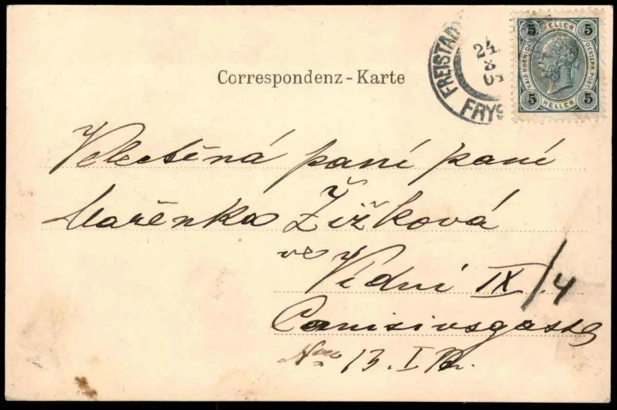 Gelaufen: 25.10.1902 mit Stempel Freistadt nach Víden Wien IX