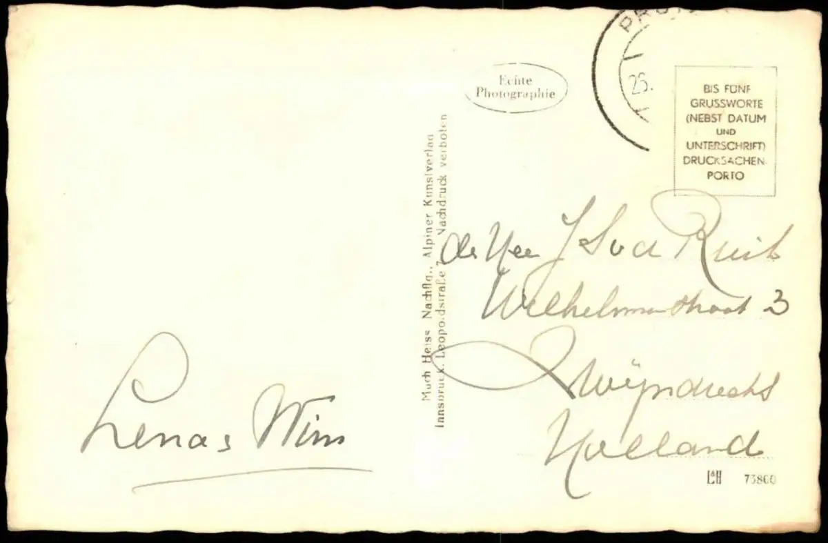 Gelaufen: 26.xx.19xx in die Niederlande, Briefmarke (sauber) entfernt