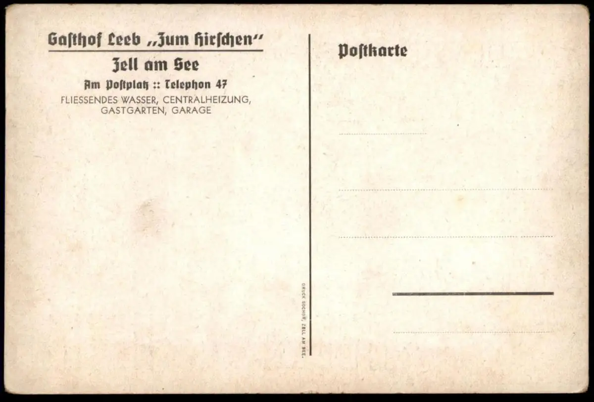 ALTE POSTKARTE ZELL AM SEE GASTHOF LEEB ZUM HIRSCHEN AM POSTPLATZ FLIESSENDES WASSER CENTRALHEIZUNG GASTGARTEN GARAGEVerlag: Druck Sochor, Zell am See