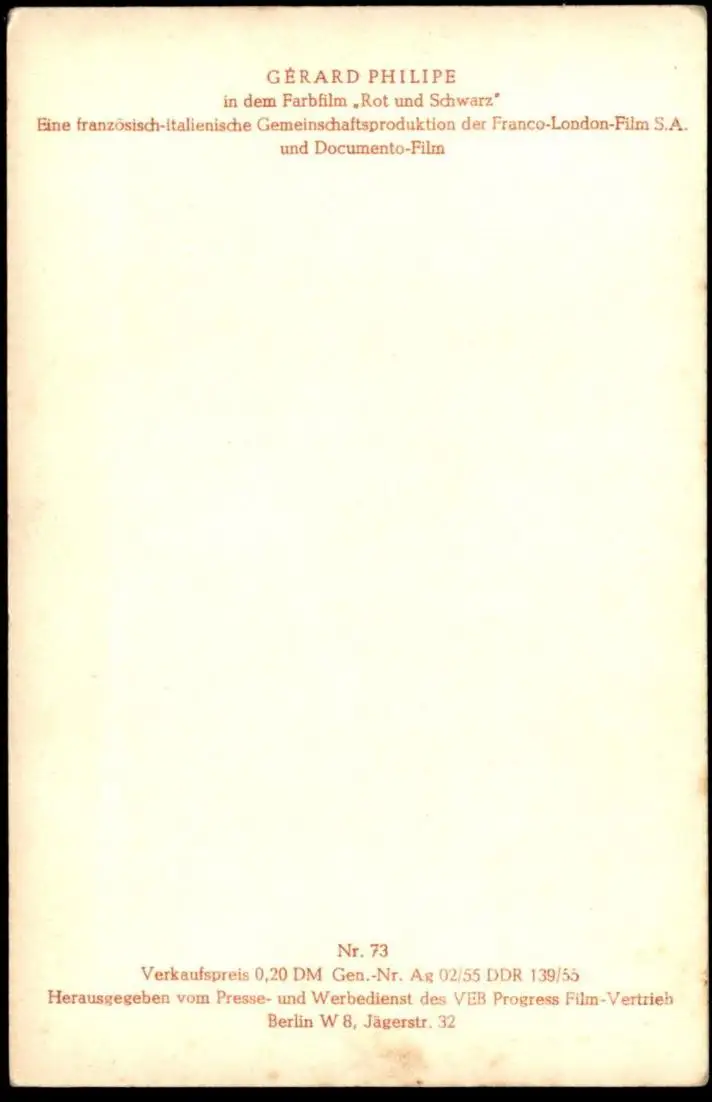 ALTE POSTKARTE GÉRARD PHILIPE FILM-SCHAUSPIELER FARBFILM ROT UND SCHWARZ EINE FRANZÖSISCH-ITALIENISCHE GEMEINSCHAFTSPRODUKTION DER FRANCO-LONDON-FILM S.A. UND DOCUMENTO FILMVerlag: Presse- und Werbedienst des VEB Progress Film-Vetrieb, Berlin