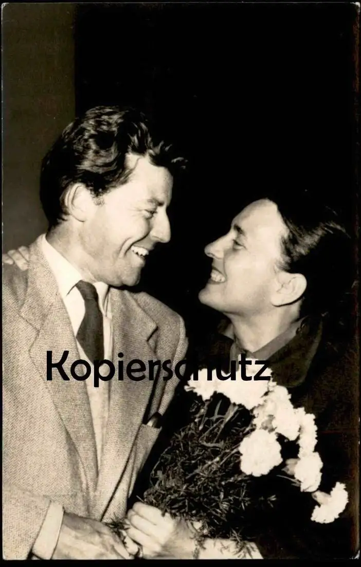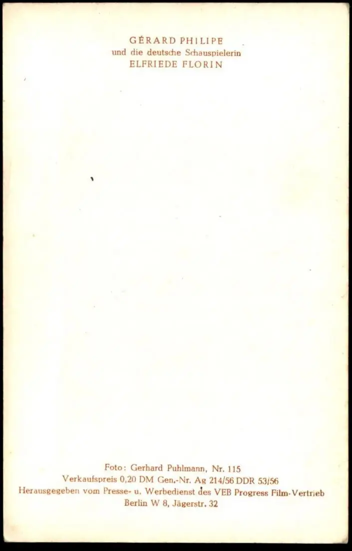 ALTE POSTKARTE GÉRARD PHILIPE FILM-SCHAUSPIELER UND DIE DEUTSCHE SCHAUSPIELERIN ELFRIEDE FLORINVerlag: Presse- und Werbedienst des VEB Progress Film-Vetrieb, Berlin; Foto Gerhard Puhlmann
