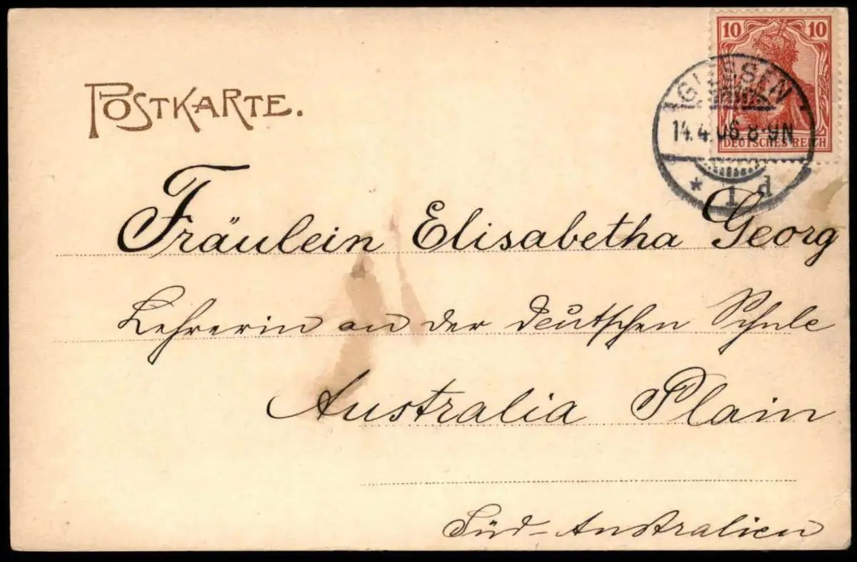 ALTE POSTKARTE GIESSEN UNIVERSITÄT AN LEHRERIN ELISABETHA GEORG DEUTSCHE SCHULE AUSTRALIA PLAIN AUSTRALIEN Donauschwaben