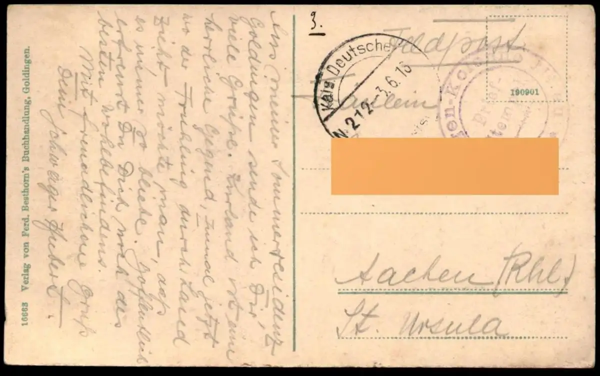 Gelaufen: 03.06.1916 als Feldpost nach Aachen Erhaltung (s. Scan): gut - sehr gut / 918829