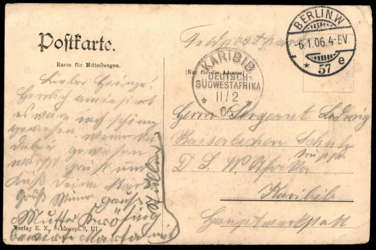Gelaufen: 06.01.1906 mit Stempel Berlin nach Karibib Deutsch-SüdwestafrikaErhaltung (s. Scan): gut - mittel, minimal bestoßen, links oben Abrieb / 916340