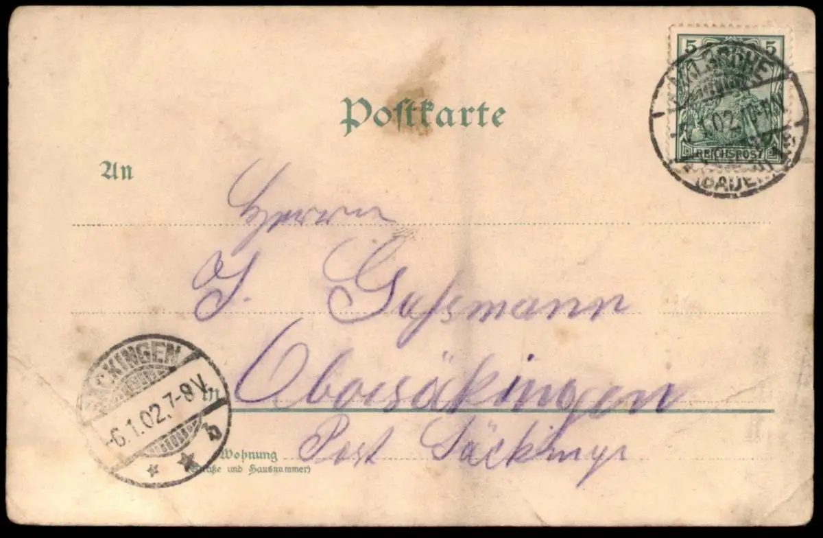 Gelaufen: 05.01.1902 mit Stempel Karlsruhe nach Obersäckingen