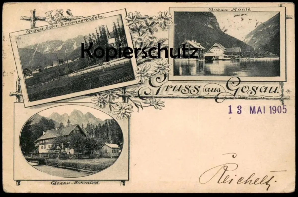 ALTE POSTKARTE GRUSS AUS GOSAU 1905 SCHMIED MÜHLE DONNERKOGELN Bezirk Gmunden Stempel Heinrich Reichelt Warnsdorf Böhmen
