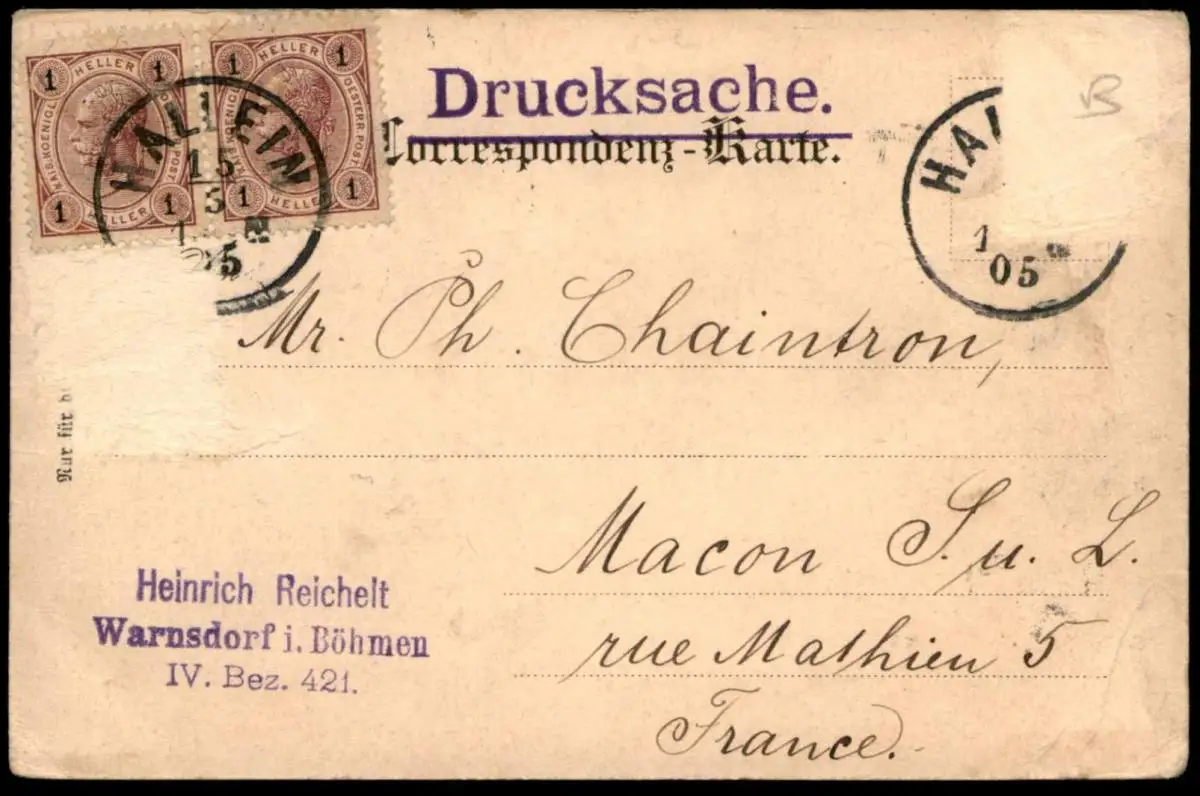 Gelaufen: 13.05.1905 mit Stempel Hallein nach Macon, zwei von vier Briefmarken mit etwas Spuren entfernt, Unterschrift Verfasser (Heinrich) Reichelt