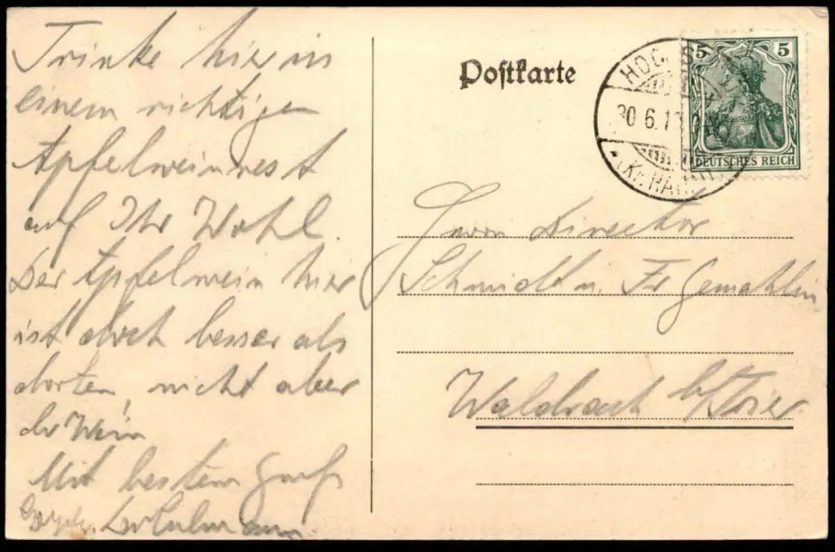 Gelaufen: 30.06.1913 mit Stempel Hochstadt nach Waldrach bei Trier