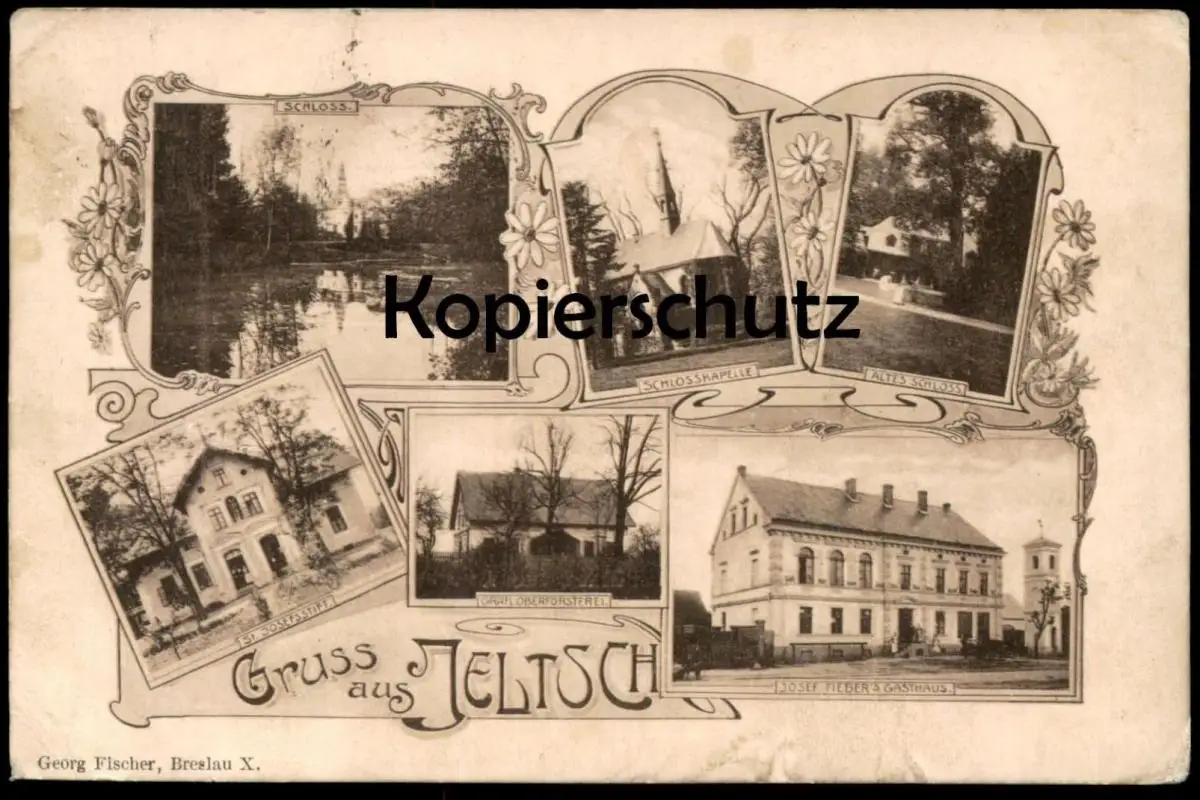 ALTE POSTKARTE GRUSS AUS JELTSCH JOH. FIEBER´S GASTHAUS GRÄFLICHE OBERFÖRSTEREI ST. JOSEFSSTIFT SCHLOSS SCHLOSSKAPELLE ALTES SCHLOSSVerlag: Georg Fischer, Breslau X.