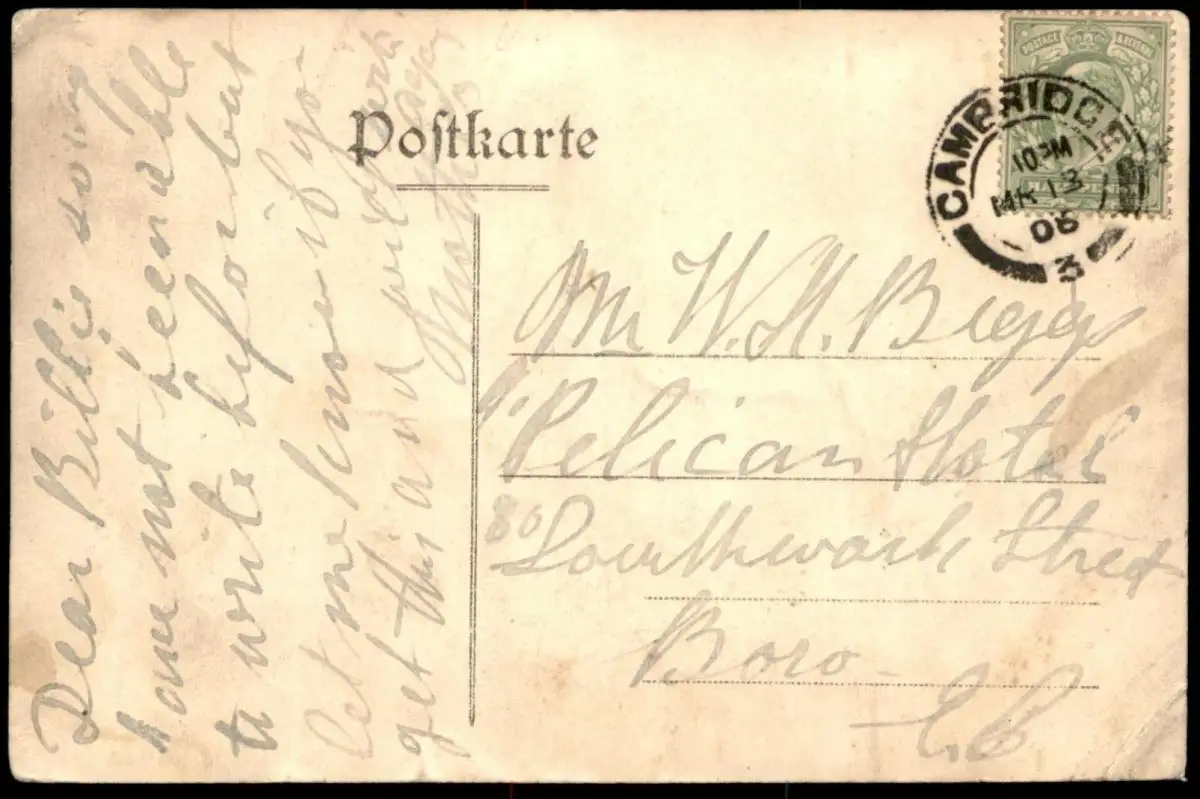 Gelaufen: 13.03.1906 mit Stempel Camebridge nach Pelican Hotel Southwark Street Boro (London)