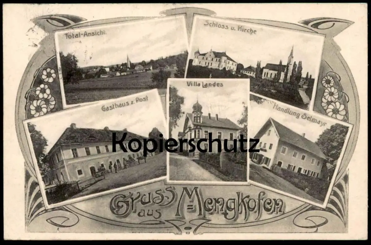ALTE POSTKARTE GRUSS AUS MENGKOFEN GASTHAUS ZUR POST VILLA LANDES HANDLUNG SELMAYR TOTAL-ANSICHT SCHLOSS UND KIRCHE