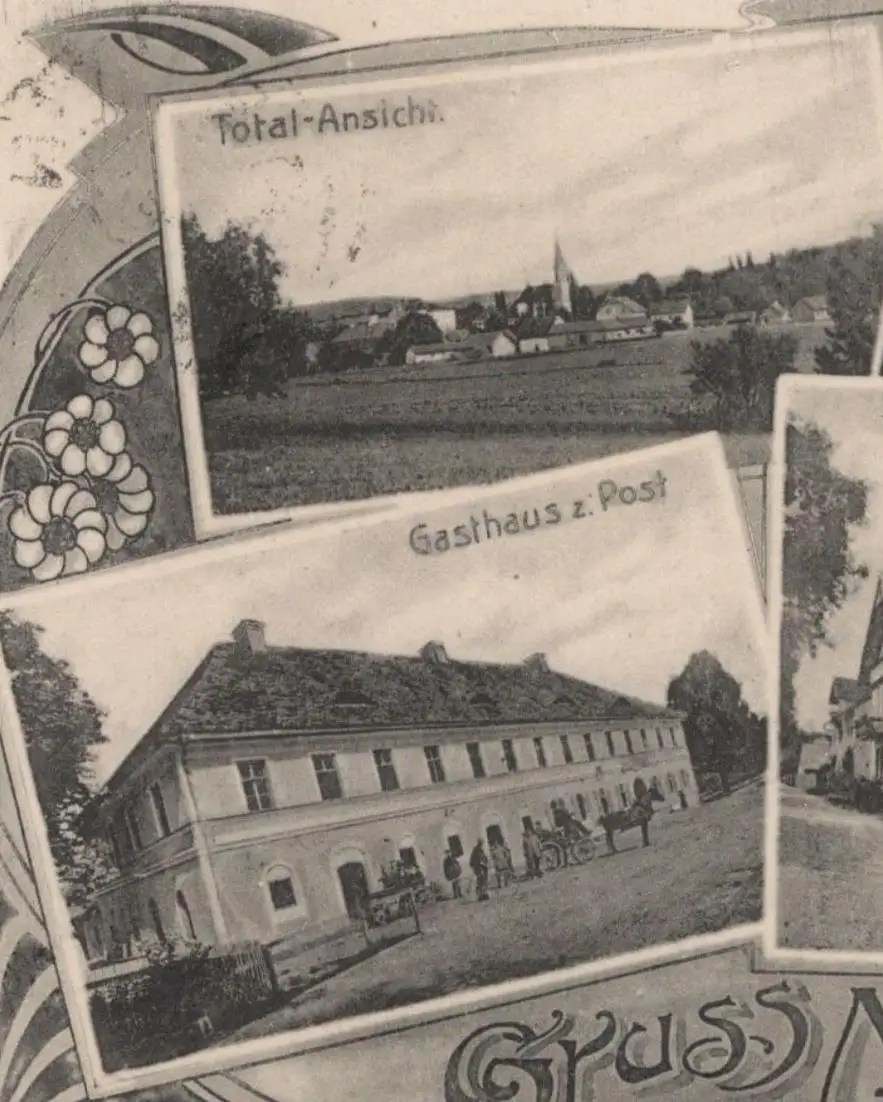 ALTE POSTKARTE GRUSS AUS MENGKOFEN GASTHAUS ZUR POST VILLA LANDES HANDLUNG SELMAYR TOTAL-ANSICHT SCHLOSS UND KIRCHEVerlag: unbekannt