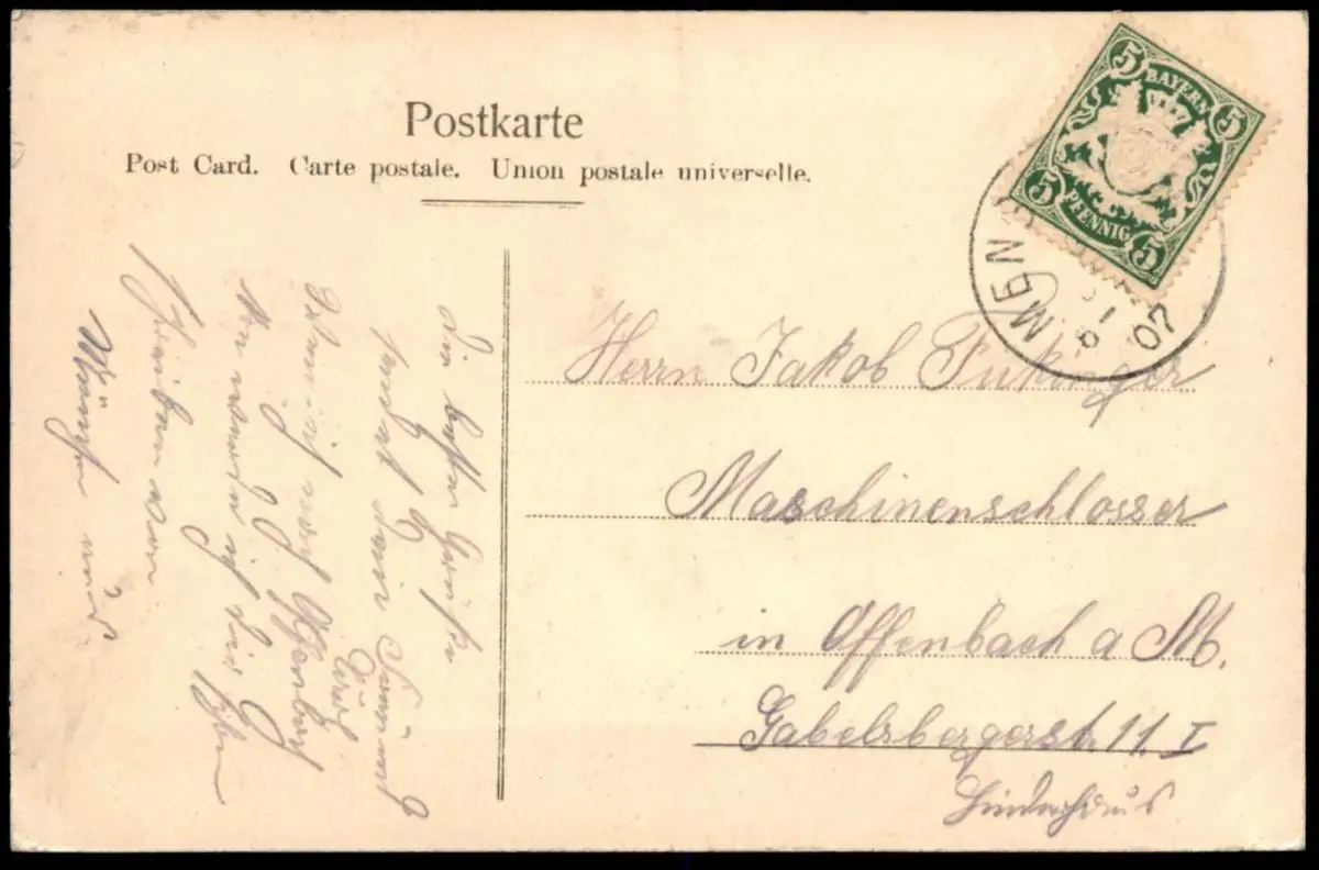 Gelaufen: xx.xx.1907 mit Stempel Mengkofen nach Offenbach an einen Maschinenschlosser