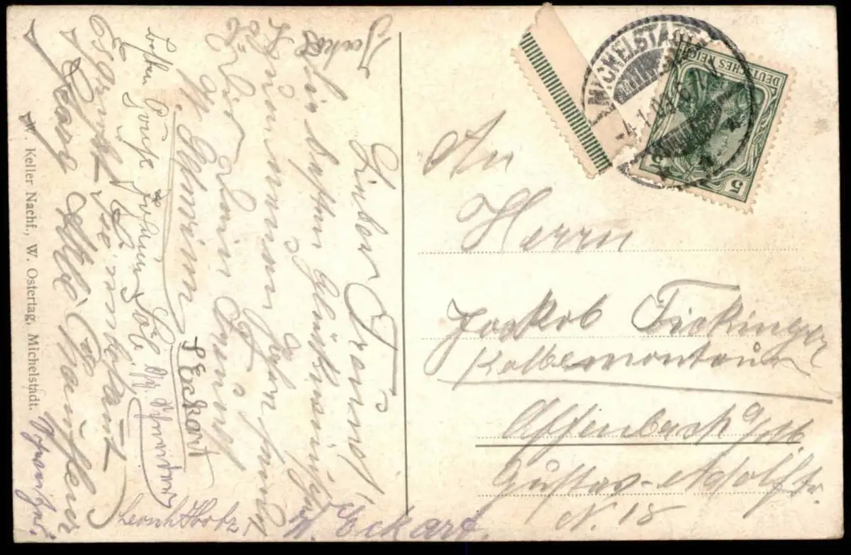 Gelaufen: 04.01.1909 mit Stempel Michelstadt nach Offenbach