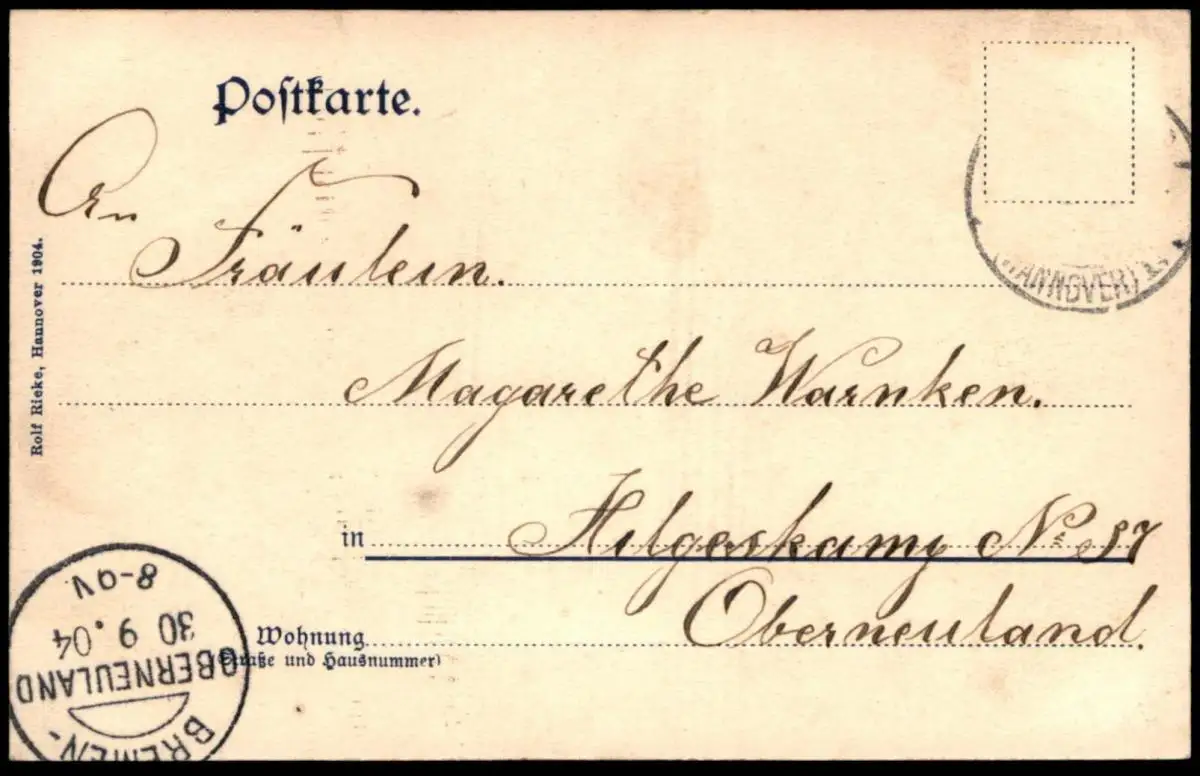 Gelaufen: 30.09.1904 nach Bremen Oberneuland, Briefmarke (sauber) entfernt