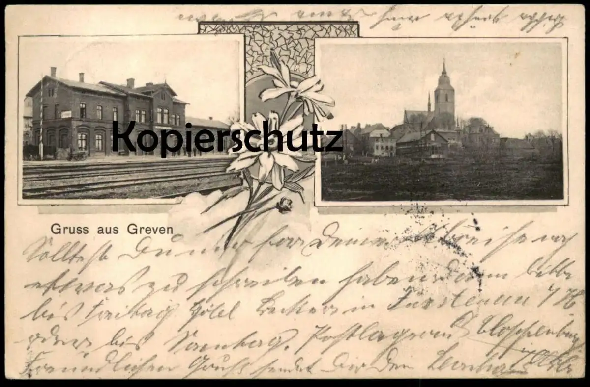ALTE POSTKARTE GRUSS GREVEN IN WESTFALEN BAHNHOF KIRCHE station gare Ansichtskarte cpa postcard