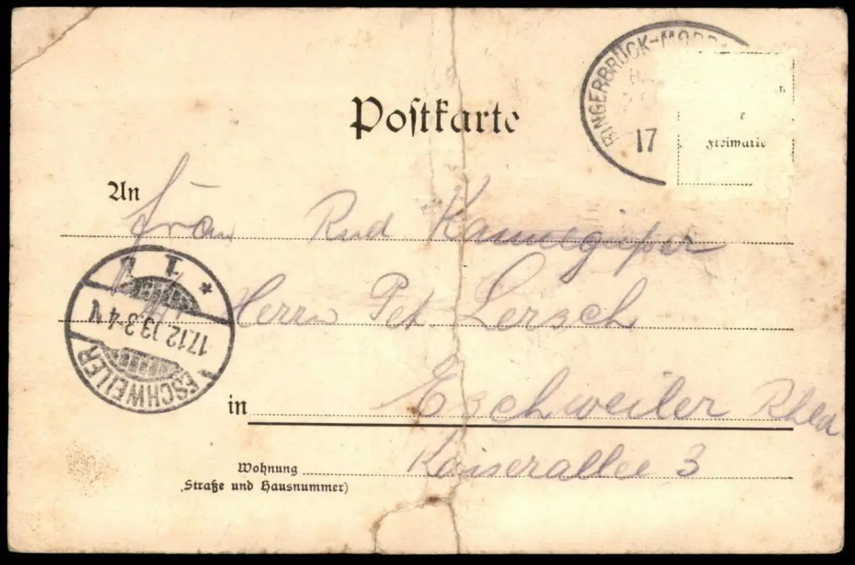 Gelaufen: 17.12.1903 mit Bahnpoststempel Bingerbrück... sowie Ankunftsstempel EschweilerErhaltung (s. Scan): schlechter, mittiger Knick & bestoßen / 917517