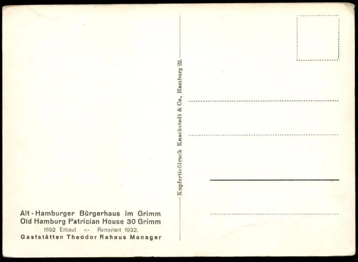 ALTE POSTKARTE HAMBURG ALT-HAMBURGER BÜRGERHAUS IM GRIMM DIE PRÄCHTIGE KAUFMANNSDIELE ERBAUT 1692 RENOVIERT 1932 GASTSTÄTTEN THEODOR RAHAUS MANAGERVerlag: Knackstedt & Co., Hamburg
