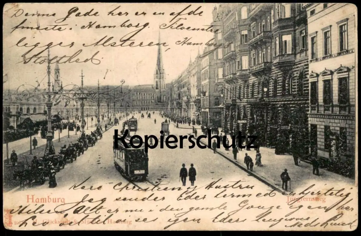 ALTE POSTKARTE HAMBURG JUNGFERNSTIEG 1902 STRASSENBAHN COIFFEUR CIGARREN TRAM tramway Ansichtskarte AK postcard cpa