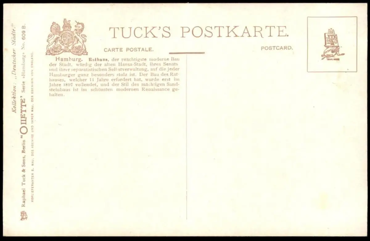 ALTE POSTKARTE OILETTE RAPHAEL TUCK DEUTSCHE STÄDTE SERIE RATHAUS HAMBURG NO. 609 F. V. KAMPTZVerlag: Raphael Tuck