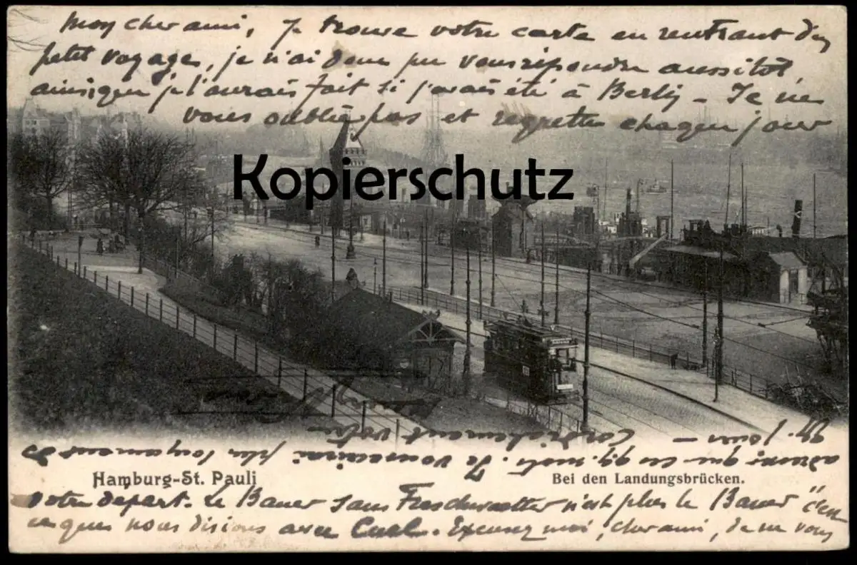 ALTE POSTKARTE HAMBURG ST. PAULI BEI DEN LANDUNGSBRÜCKEN STRASSENBAHNVerlag: Knackstedt & Näther Lichtdrucke, Hamburg 1904Gelaufen: xx.xx.190x nach Colchester, Briefmarke (sauber) abgelöstErhaltung (s. Scan): gut / 916430