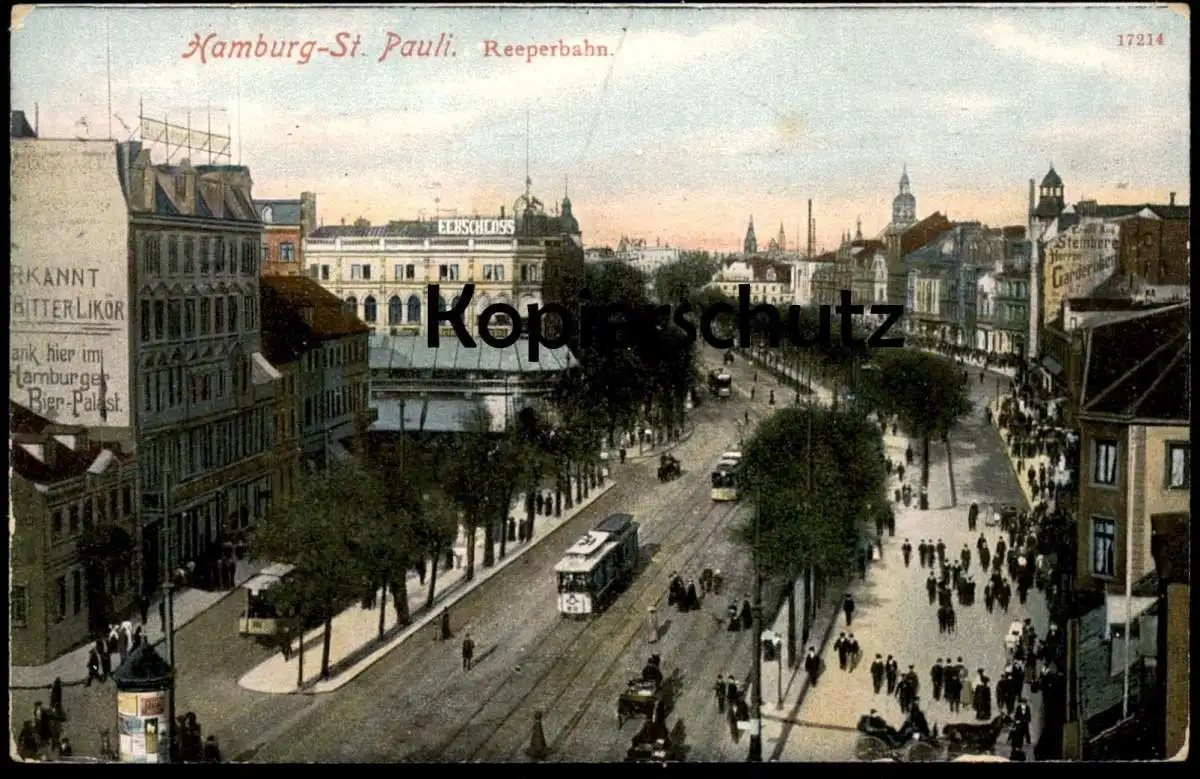 ALTE POSTKARTE HAMBURG ST. PAULI REEPERBAHN REKLAME BITTERLIKÖR AUSSCHANK HIER IM HAMBURGER BIER-PALAST STRASSENBAHNVerlag: A. N. H. 3. 1909