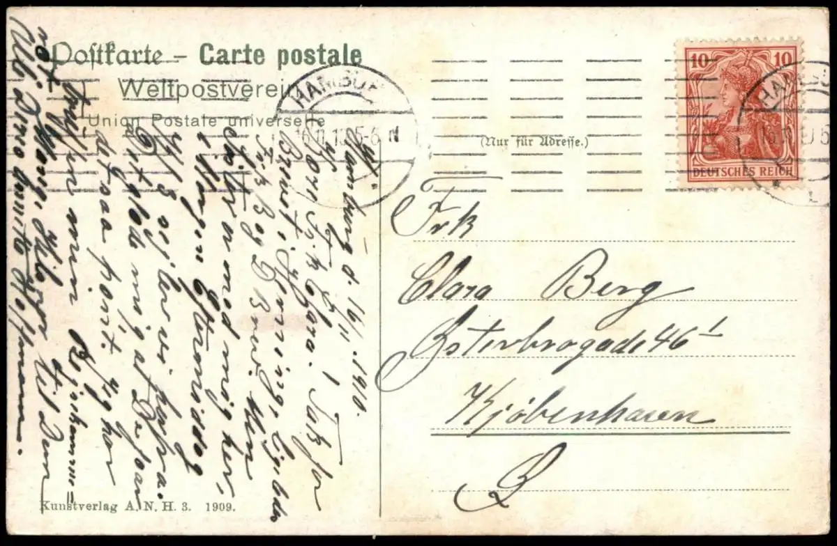 Gelaufen: 16.11.1910 mit Stempel Hamburg nach Kopenhagen