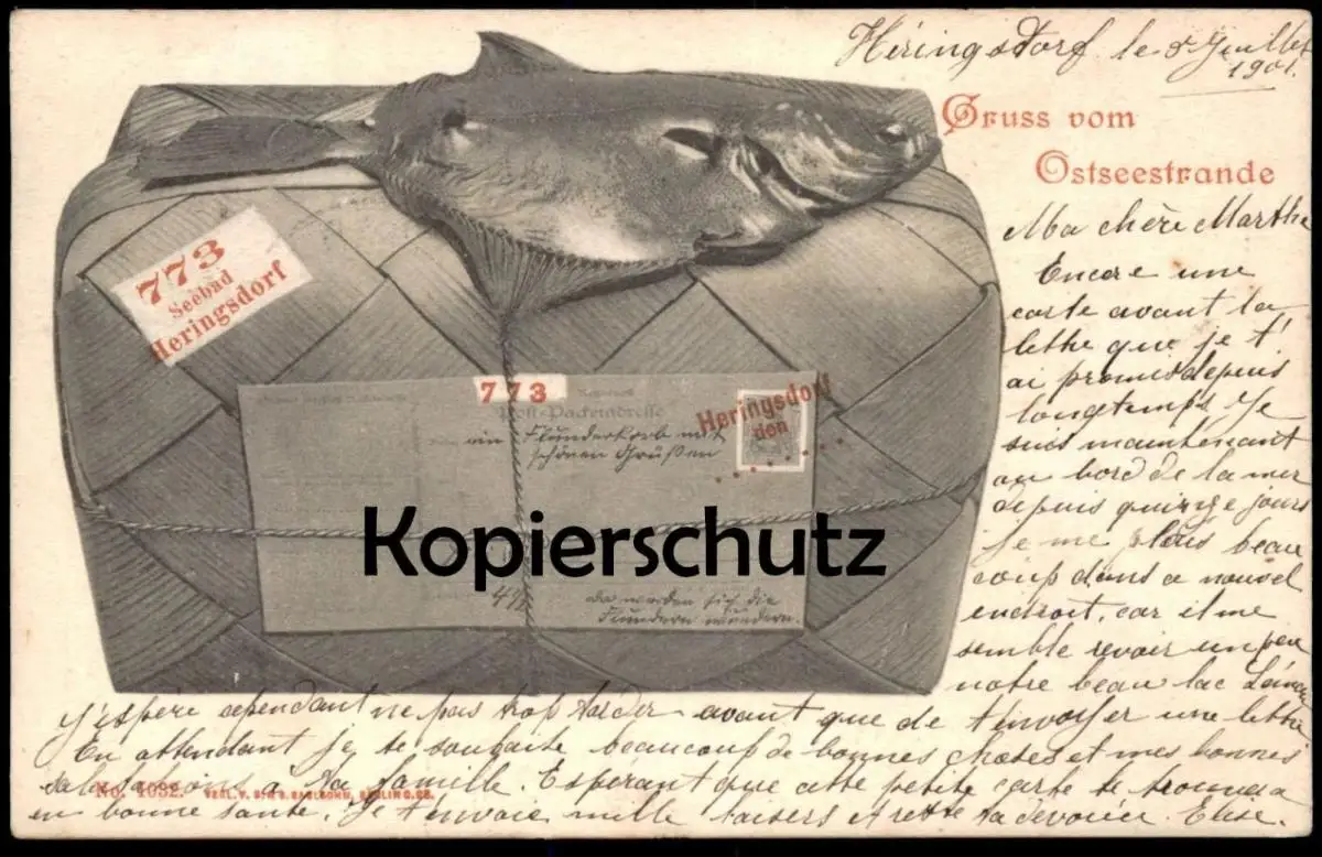 ALTE POSTKARTE HERINGSDORF GRUSS VOM OSTSEESTRANDE KOFFER SCHOLLE