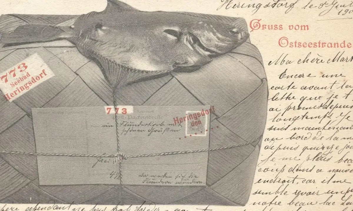 ALTE POSTKARTE HERINGSDORF SCHOLLE KOFFER GRUSS VOM OSTSEESTRANDE USEDOM Ostseestrand AK Ansichtskarte cpa postcard