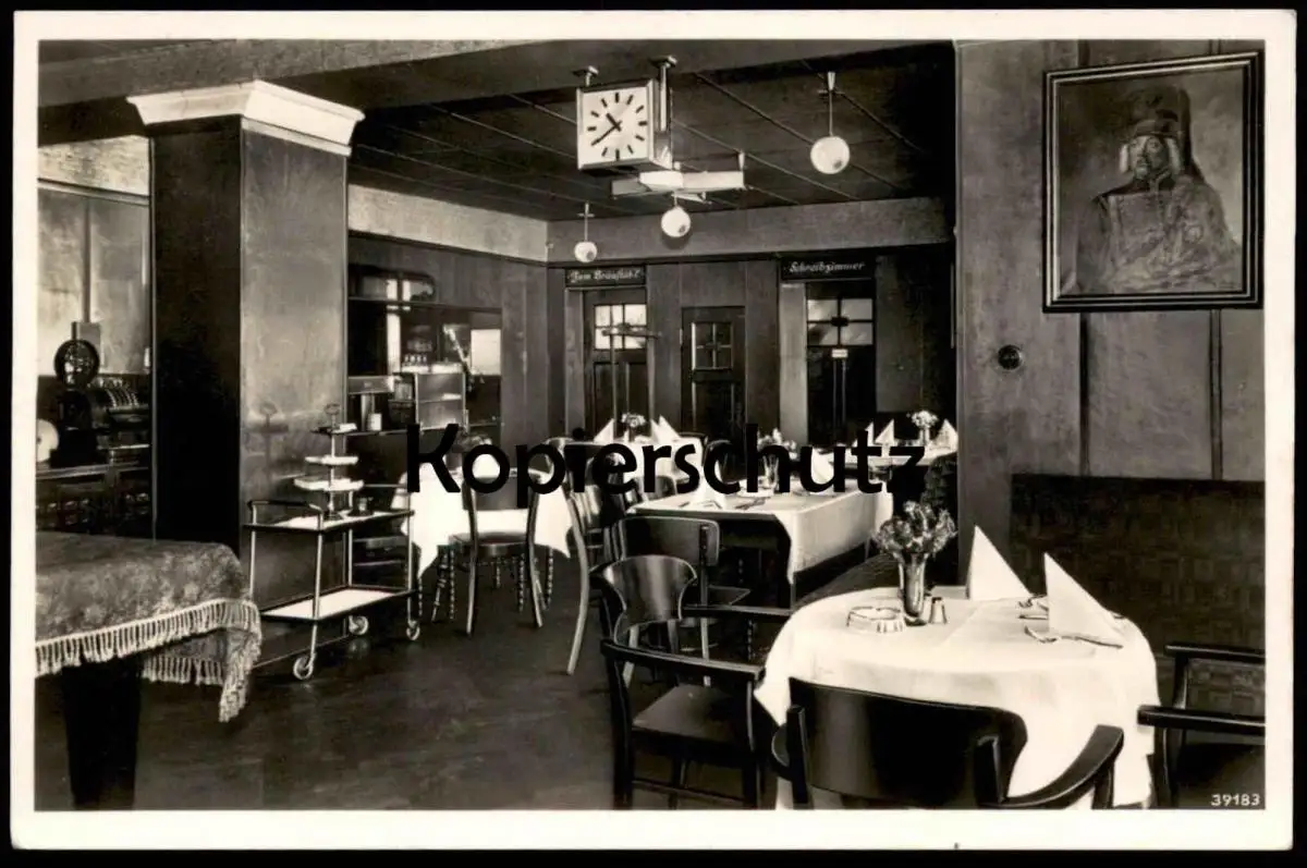 ALTE POSTKARTE HIRSCHBERG SCHLESIEN GASTZIMMER HOTEL STRAUSS AM BAHNHOF GEMÄLDE UHR SERVIERWAGEN BESCHRIFTUNG TÜREN SCHREIBZIMMER ZUM BRÄUSTÜBL