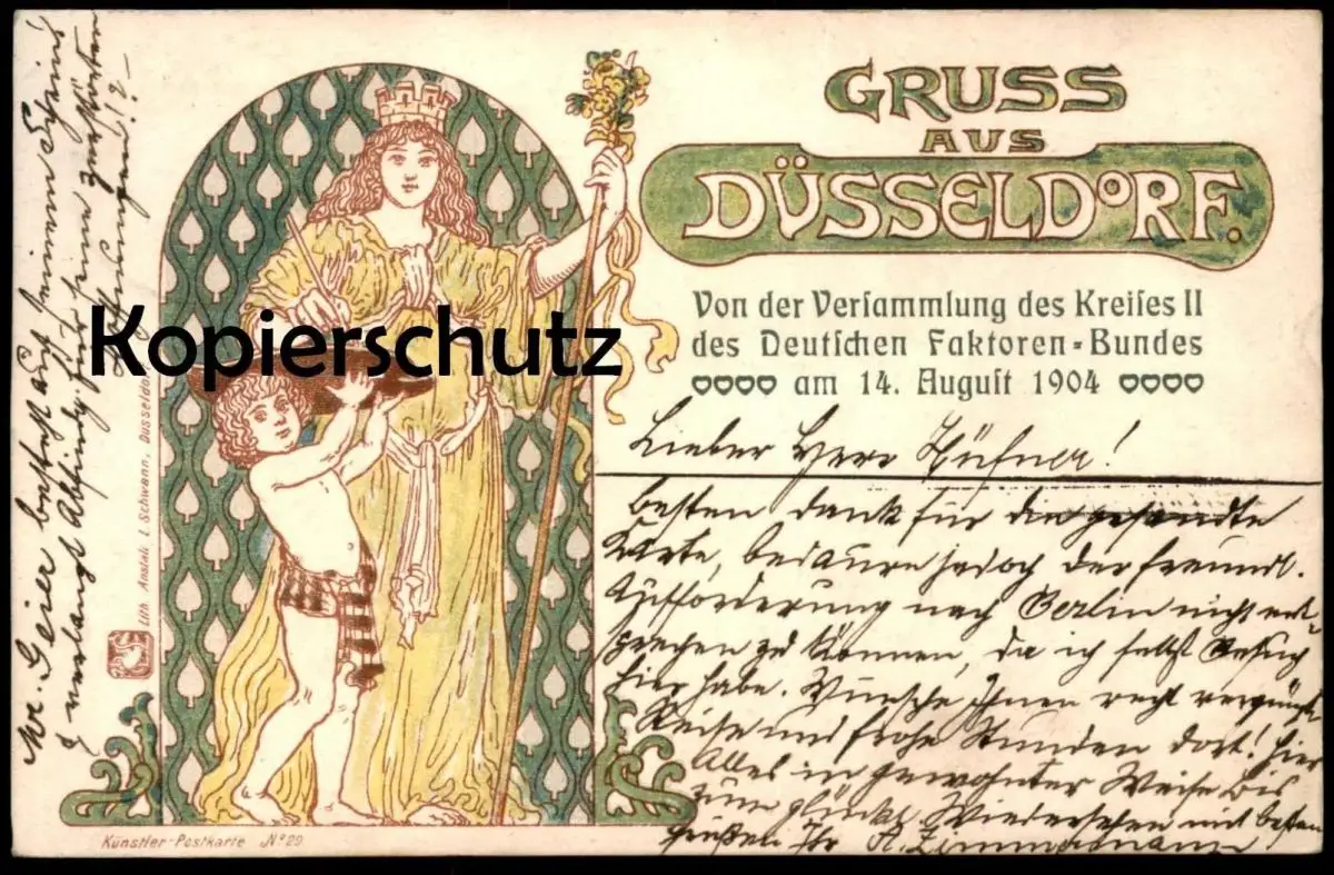 ALTE JUGENDSTIL KÜNSTLER POSTKARTE GRUSS AUS DÜSSELDORF VON DER VERSAMMLUNG DES KREISES II DES DEUTSCHEN FAKTOREN-BUNDES 14. AUGUST 1904