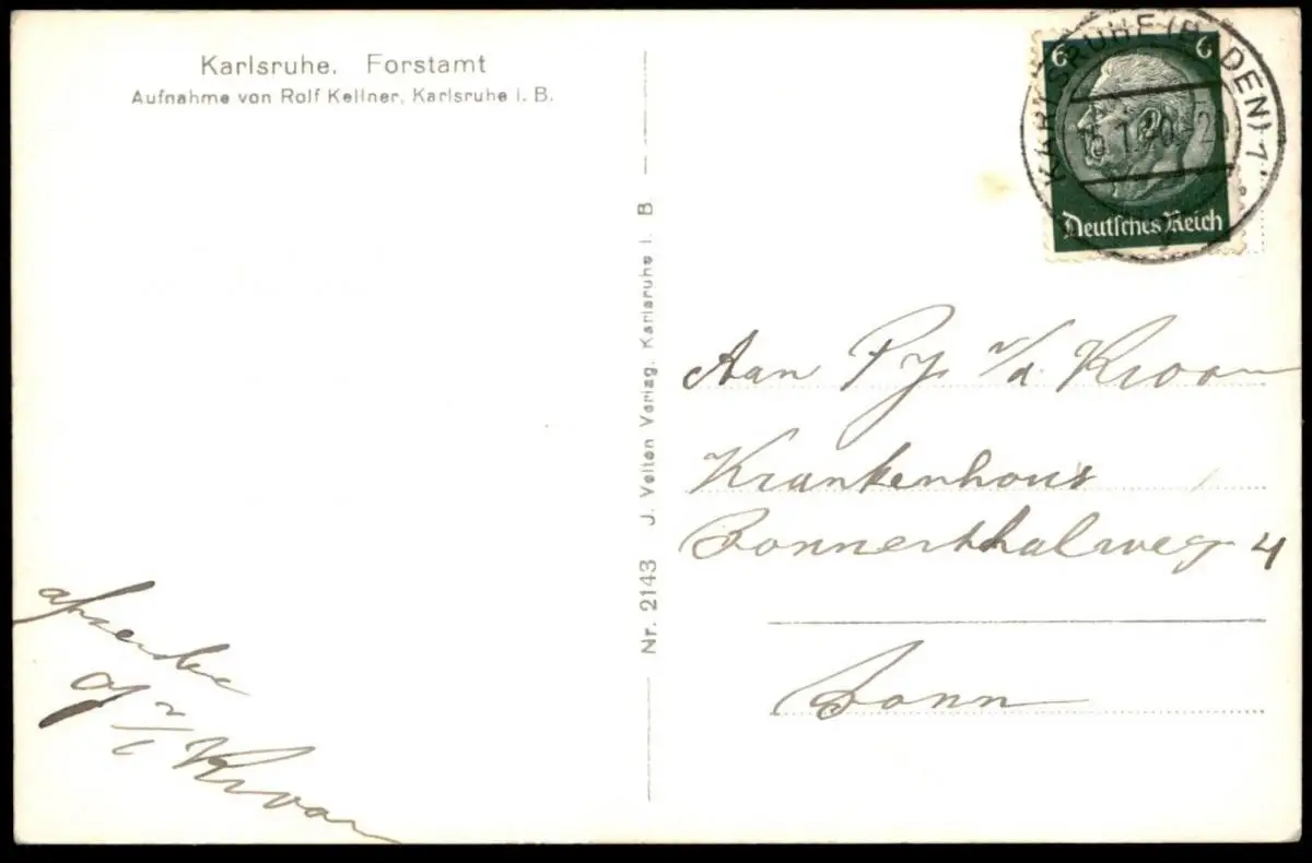 Gelaufen: 15.01.1940 mit Stempel Karlsruhe, Baden nach Bonn Krankenhaus Bonner Talweg 4