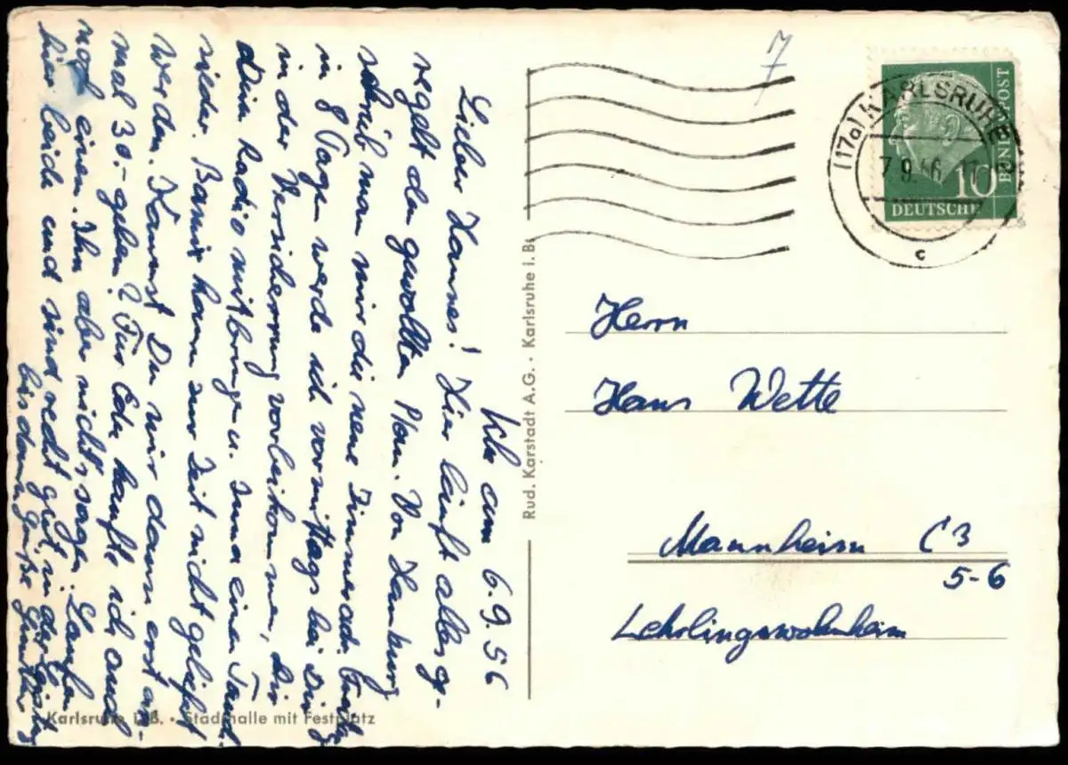Gelaufen: 06.09.1956 mit Stempel Karlsruhe nach Mannheim Lehrlingswohnheim