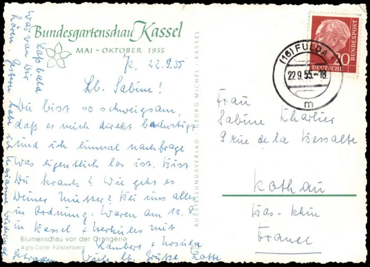 Gelaufen: 22.09.1955 mit Stempel Fulda nach Rothau