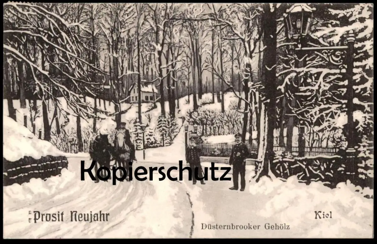 ALTE POSTKARTE KIEL 1908 PROSIT NEUJAHR DÜSTERNBROOKER GEHÖLZ Düsternbrook Winter Schnee snow Uniform Pferde postcard AK